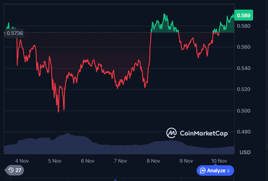 The live Cardano price today is around $0.5894, up 2.79% this week. Cardano crypto price movements show a mix of consolidation and subtle strength. Analysts describe the market as cautiously optimistic, with the next resistance zone near $0.65.