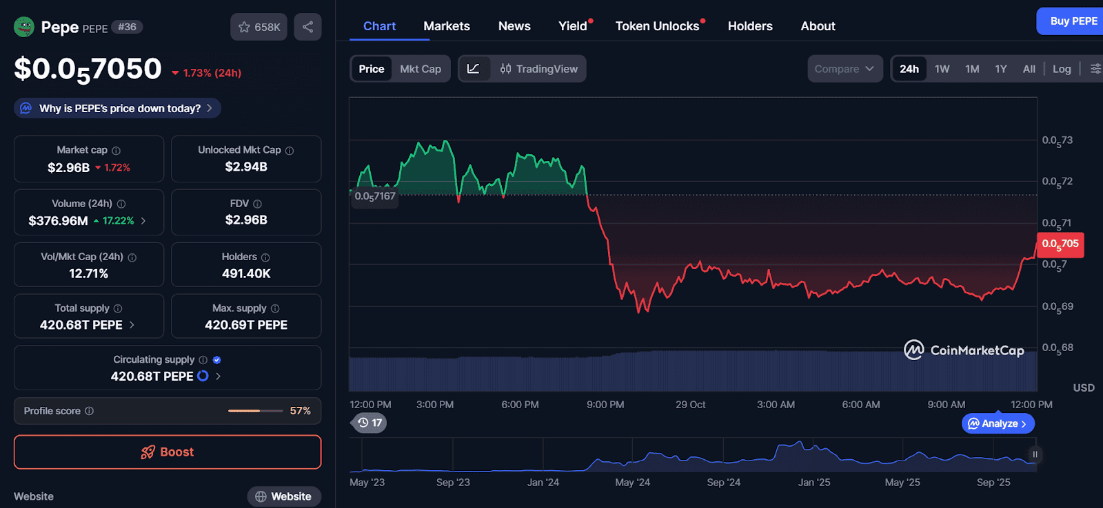 Pepe (PEPE) is trading at $0.057050, down 1.73% in the past 24 hours, as traders question whether the iconic meme token can sustain momentum after its recent consolidation.