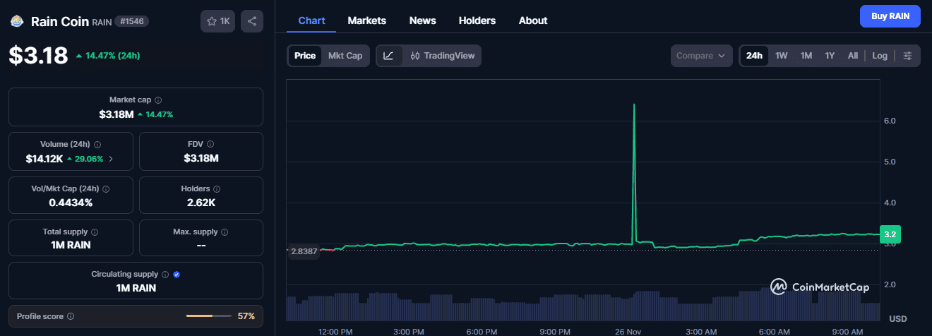 The Rain Coin price today sits at $3.18, holding a narrow trading range while momentum across the broader market continues to shift.